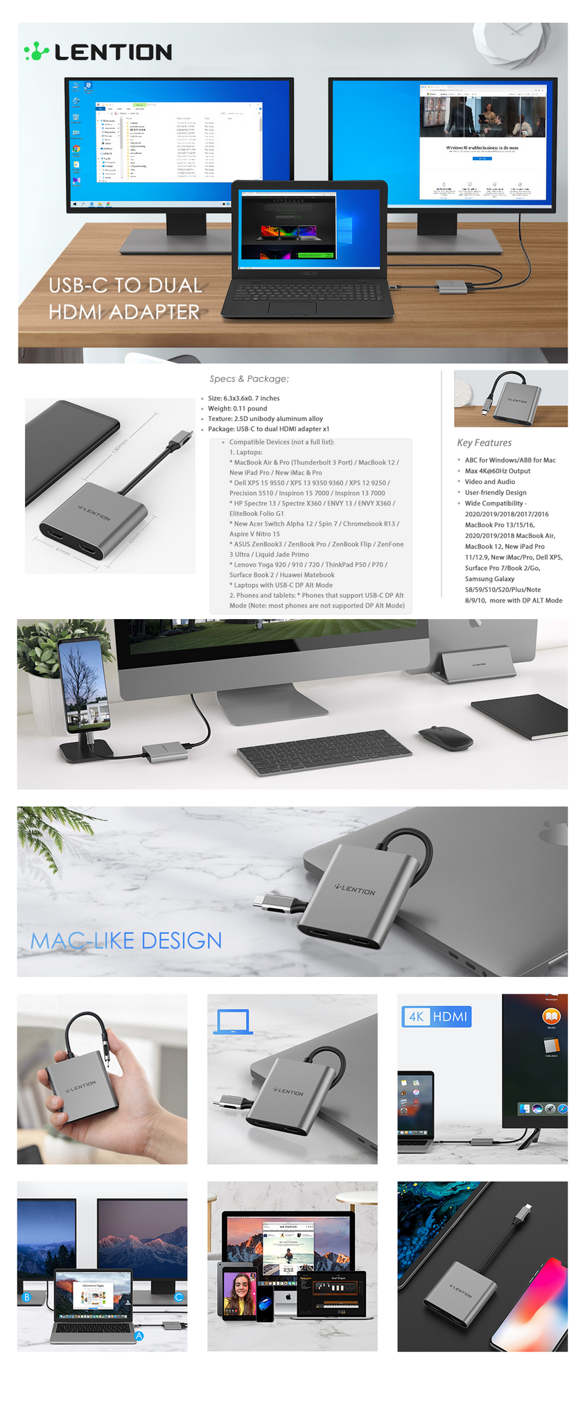 LENTION Bộ chuyển đổi USB C sang HDMI kép, hỗ trợ 4K đơn lẻ @ 60Hz và 4K kép @ 30Hz (CB-C53s)