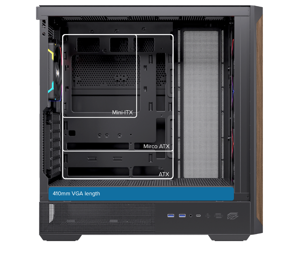 Tương thích ATX, Micro ATX, Mini ITX cùng hỗ trợ VGA dài tới 410mm, linh hoạt cho nhiều cấu hình.