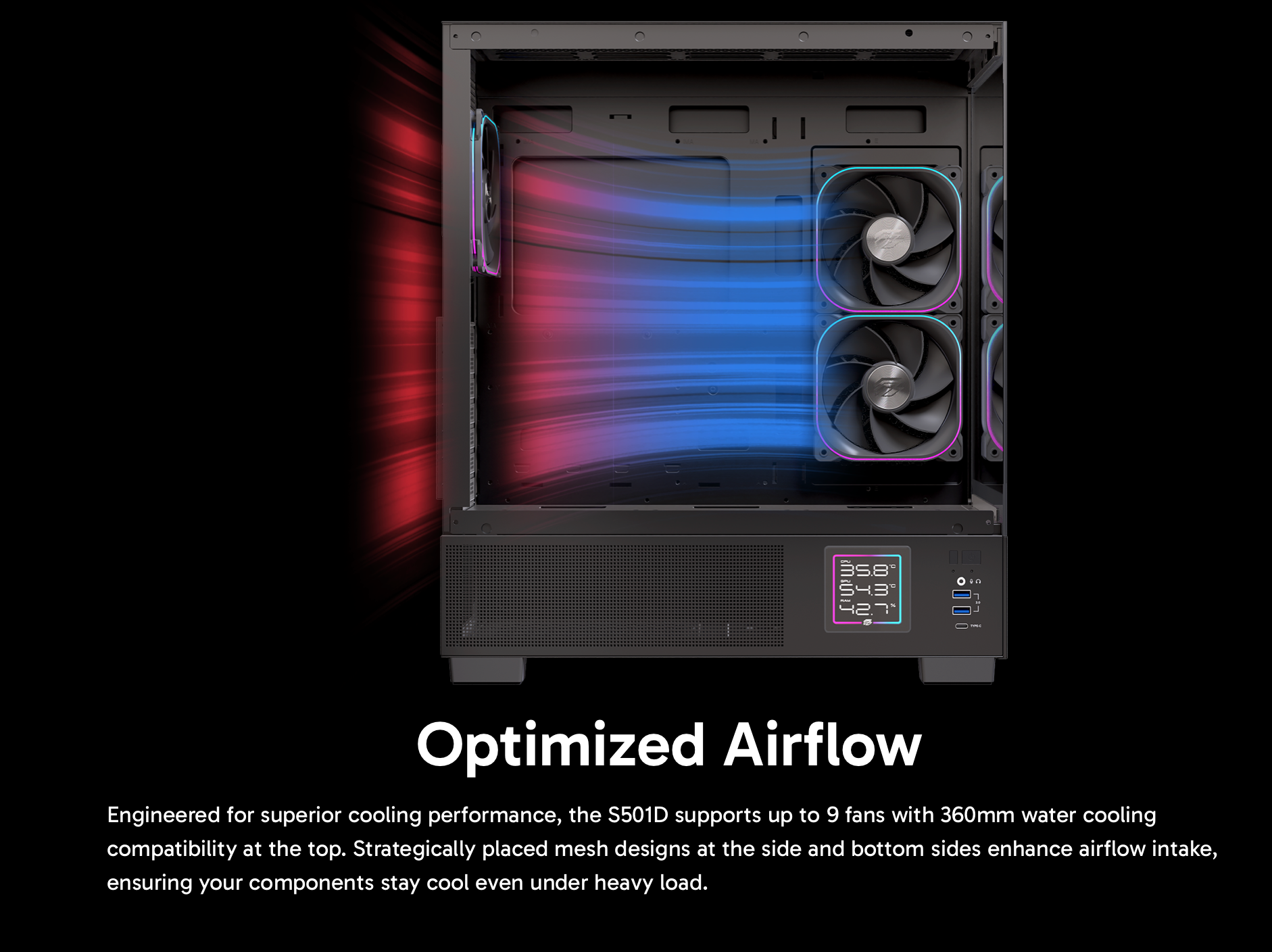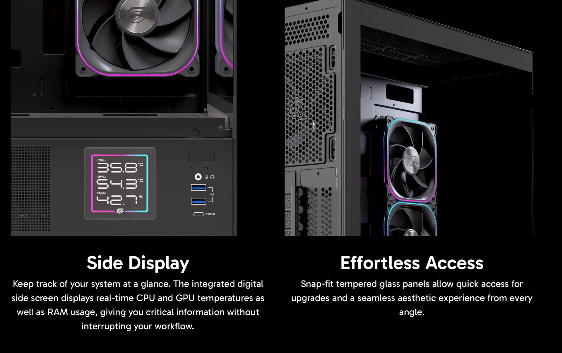 Kết nối Type-C, USB 3.0 kép, cùng không gian rộng rãi cho hiệu năng và phong cách đồng hành. Khoe trọn vẻ đẹp dàn máy của bạn với thiết kế toàn kính cường lực sang trọng và màn hình phụ hiển thị thông số hệ thống cực “xịn”.