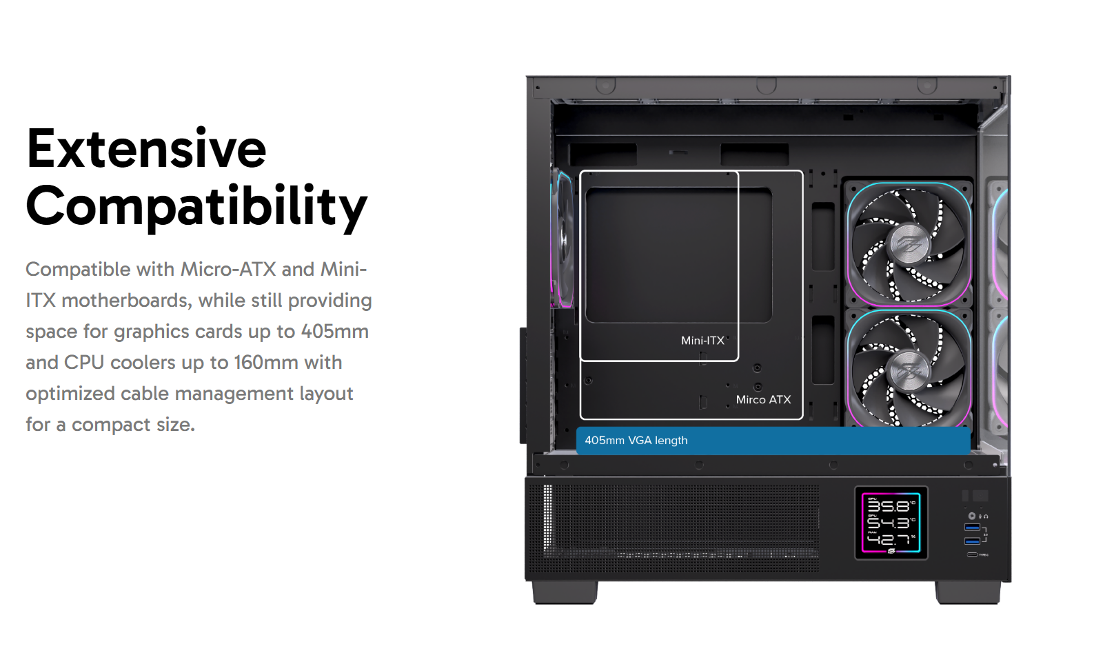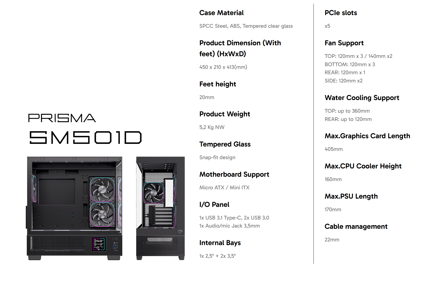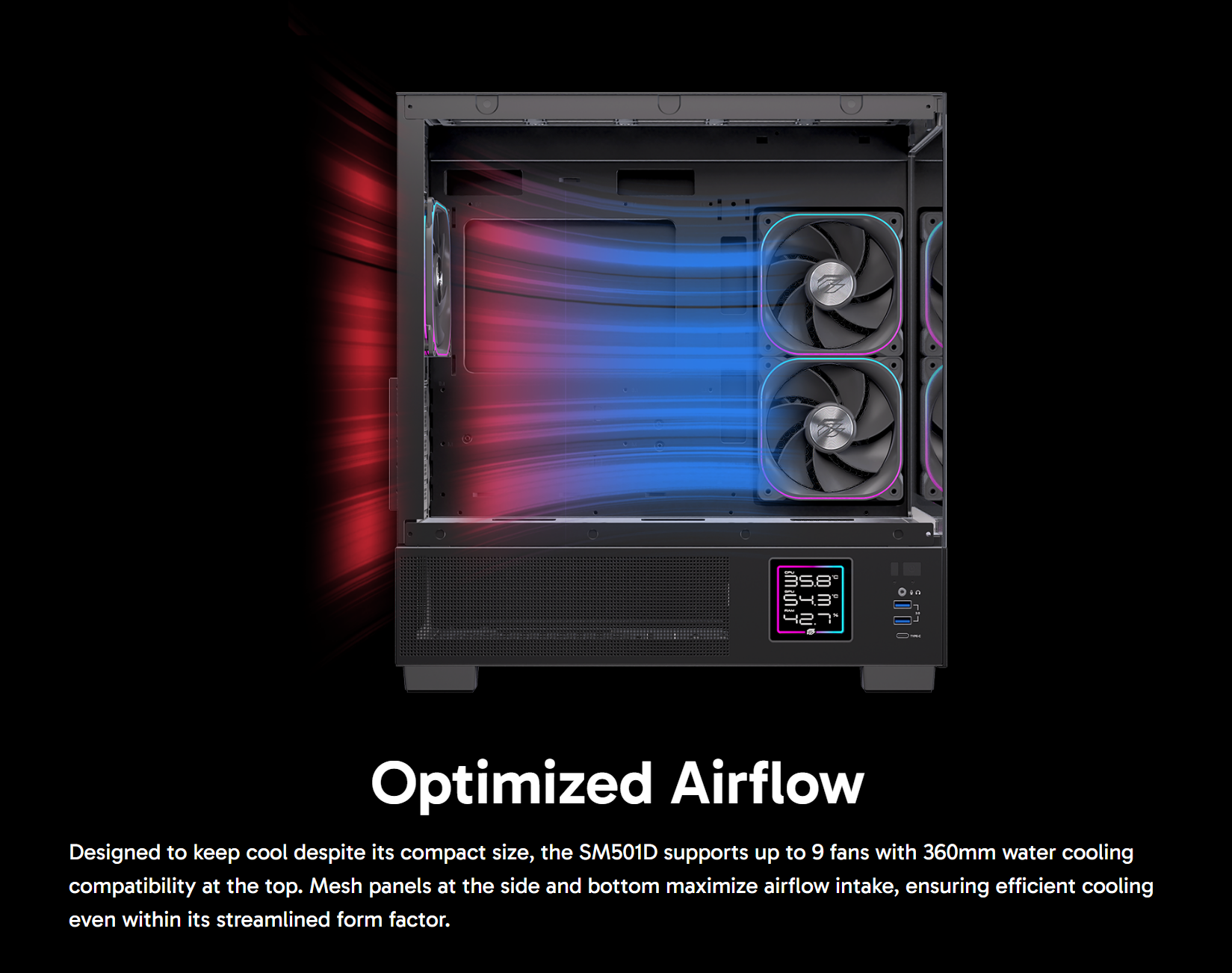 mang đến đẳng cấp mới cho những bộ máy nhỏ gọn với thiết kế kính cường lực toàn cảnh, tôn vinh trọn vẹn vẻ đẹp của từng linh kiện. Màn hình kỹ thuật số bên hông hiển thị thông số hệ thống theo thời gian thực, kết hợp hoàn hảo giữa thẩm mỹ và công nghệ. Dù sở hữu form M-ATX nhỏ gọn, SM501D vẫn hỗ trợ tản nhiệt nước 360mm, tối đa 9 quạt và tương thích với VGA dài 405mm cùng tản CPU cao 160mm — mang đến hiệu suất mạnh mẽ trong một không gian tinh gọn.