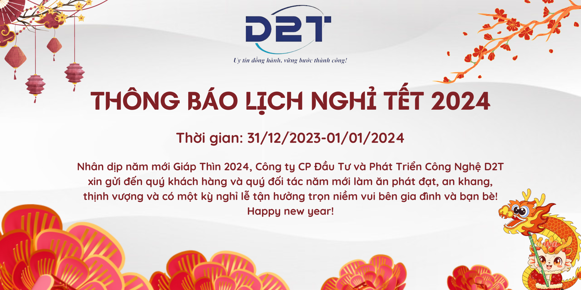 • Ngày 01/01/2024- Thứ Hai: Toàn thể nhân viên Công Ty CP Đầu tư và Phát triển Công Nghệ D2T được nghỉ 01 ngày